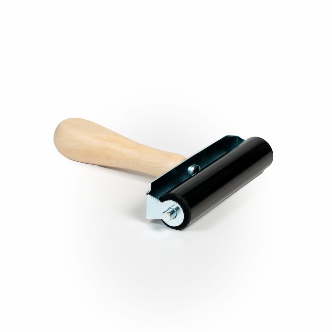 Ein Werkzeug/Gummiwalze zum Auftragen der Farbe auf den Stempel. Seine Struktur eliminiert Verformungen und macht die Farbübertragung glatt und gleichmäßig.